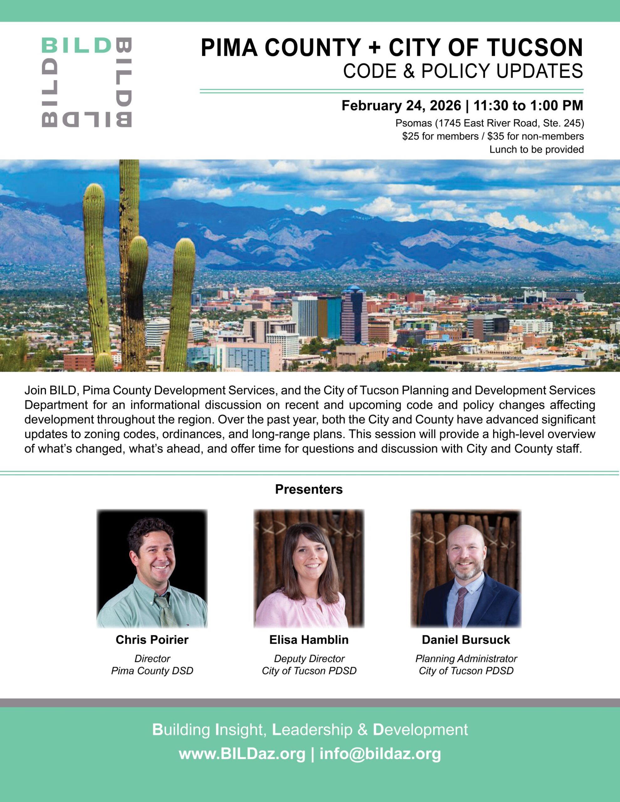 We gather on the third Tuesday of most months for a lunch meeting featuring speakers of note from the region. Past guests have included city and county officials from Tucson, Marana, Oro Valley, Sahuarita and others; leaders from the University of Arizona, Rio Nuevo and Sun Corridor; and representatives of the private sector, including home builders and developers.